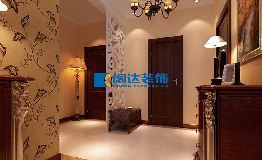 客餐廳:本案例用暖色的燈光烘托歐式的華貴檔次,深色歐式家具配以淺綠色的葉子型壁紙,為家居空間增添了一絲生命活力,玄關區域的圓形吊頂與客餐廳區域的方形吊頂配合地面的撥打線斜鋪拼花對空間功能進行了明確的劃分,提升了家居空間的整體檔次。