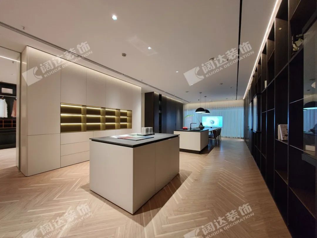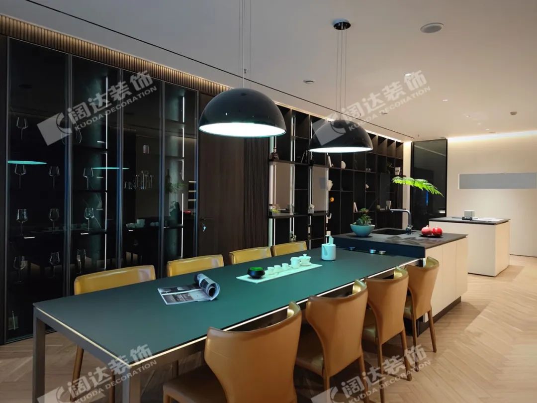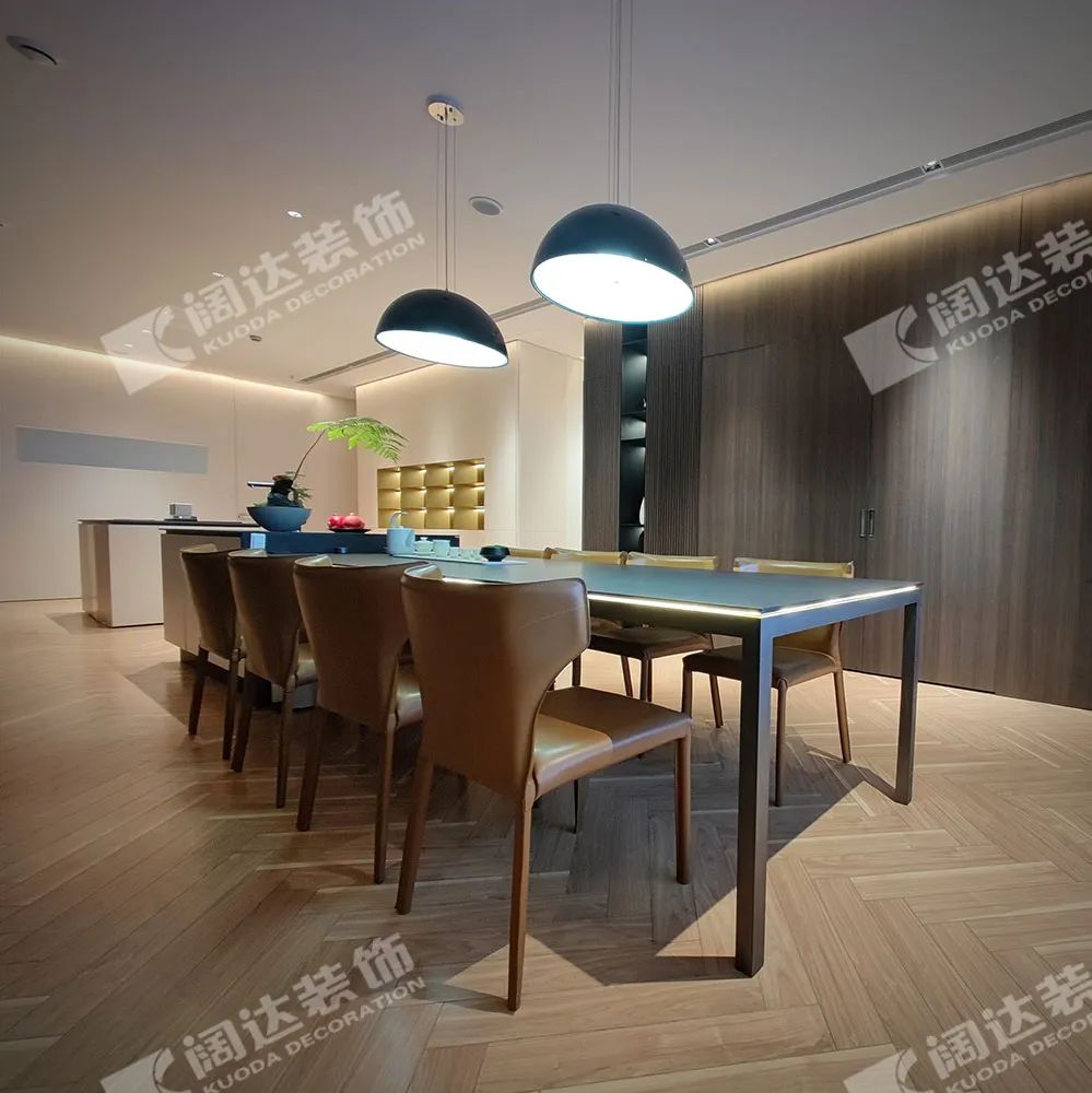 社交洽談區(qū)域采用當(dāng)代最流行的膚感飾面制作一體化島臺桌面,既提升品質(zhì),又有觸碰島臺桌面時的舒適感,在餐桌的前后分別有大面積的玻璃酒柜和可封閉式西廚操作臺,桌面邊上采用軌道插座,實(shí)用的設(shè)計(jì),滿足了用餐和辦公的雙重需求。