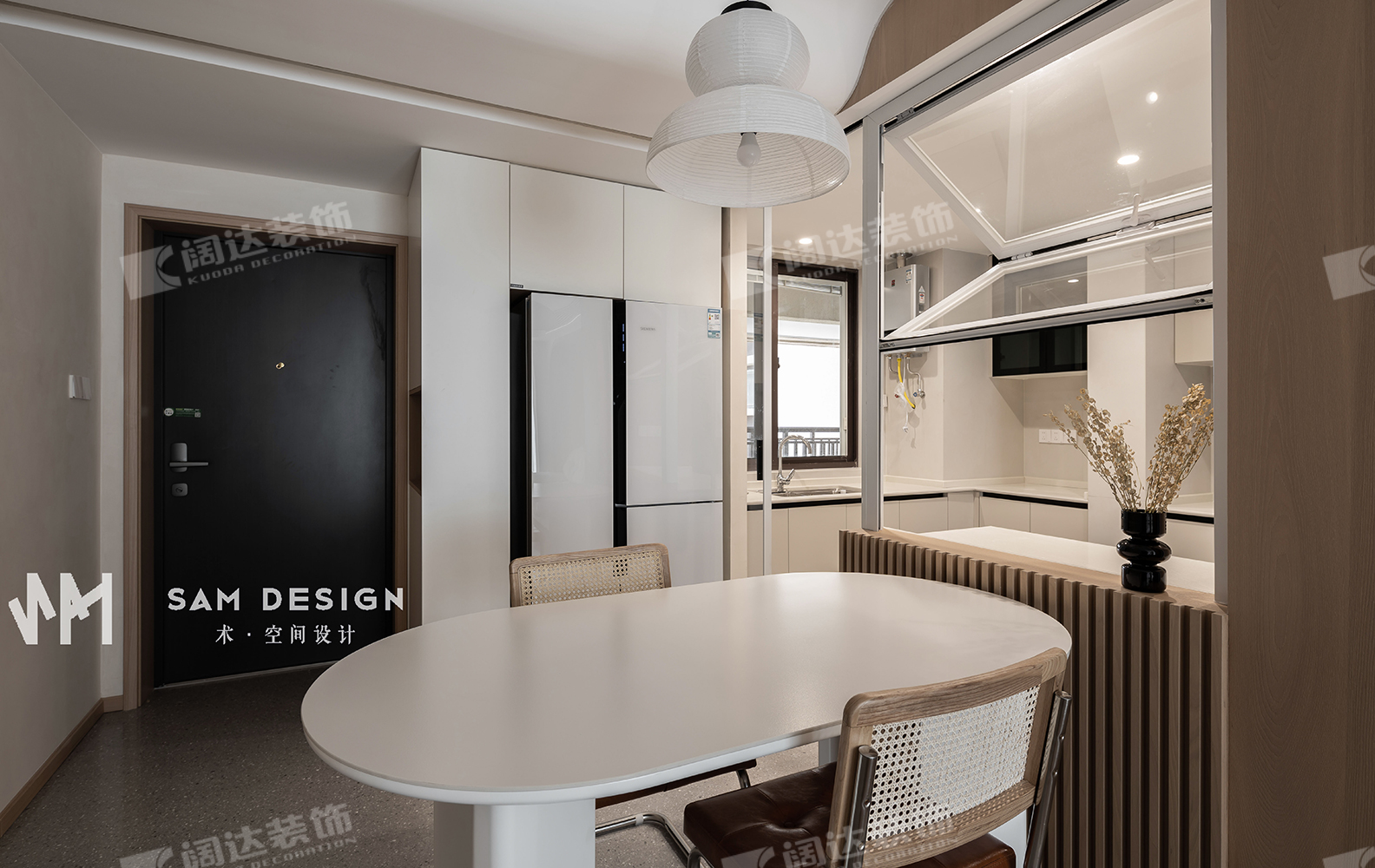整個戶型中規(guī)中矩,設(shè)計師在功能分區(qū)時,大膽地打破傳統(tǒng)廚房餐廳概念,釋放空間。