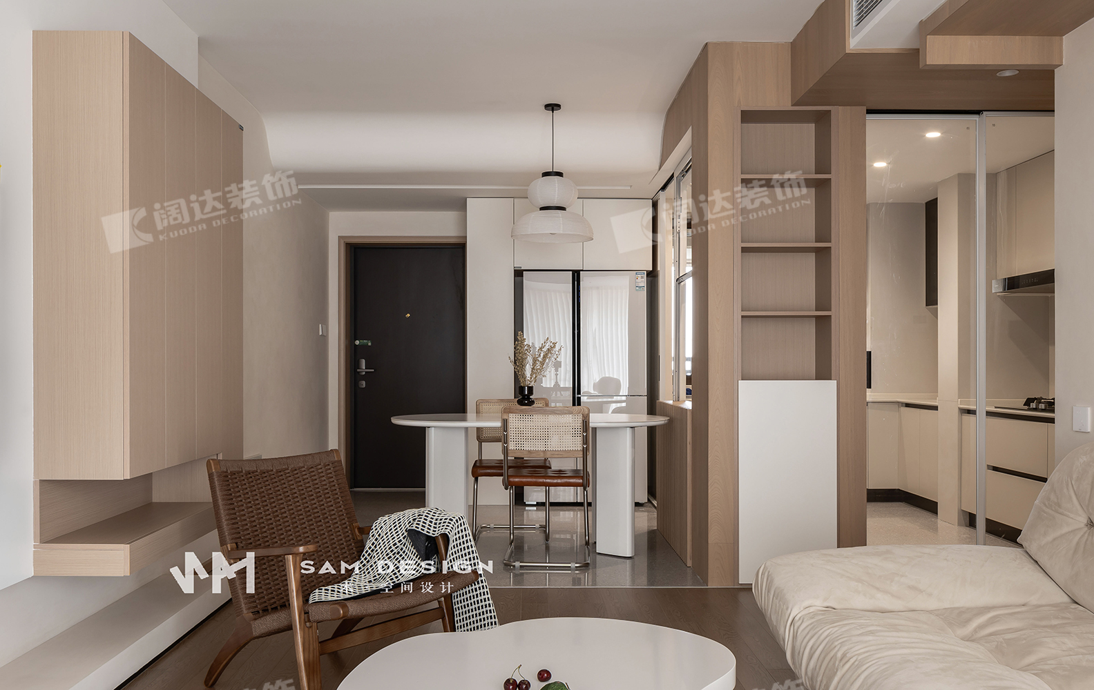 拆除了門廳左側(cè)墻壁,使得客廳、餐廳、廚房融為一體,很好地提升了空間感,入門后有寬敞的視野,不會被局限。
